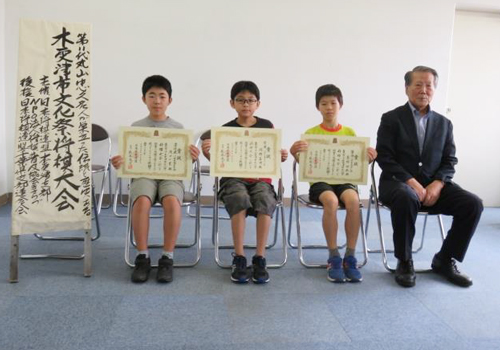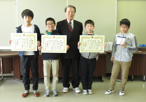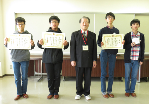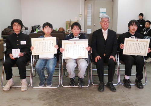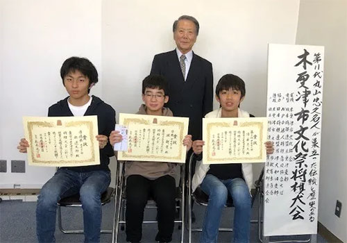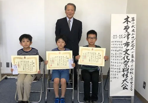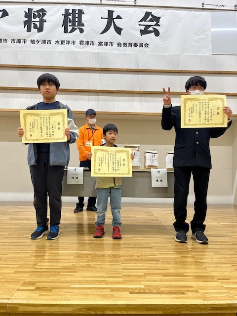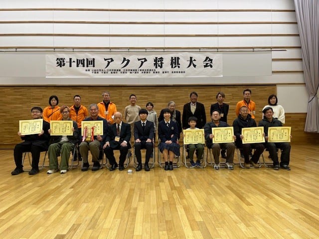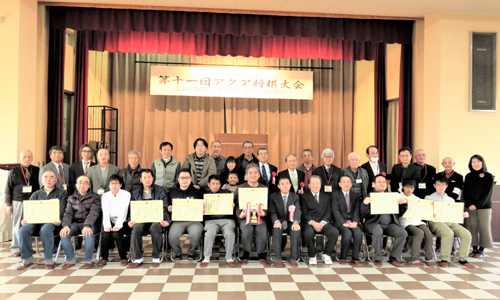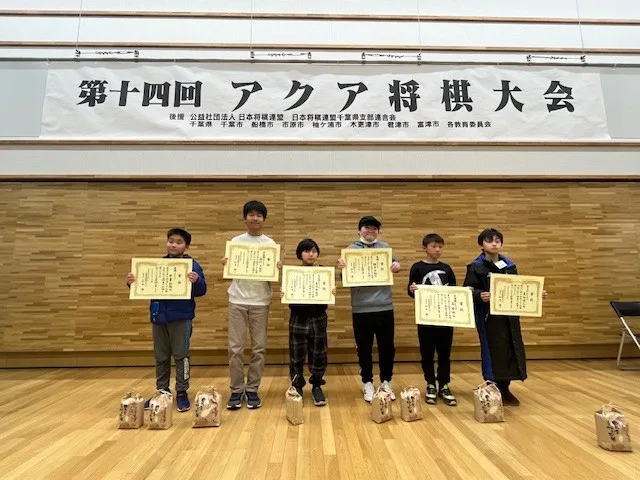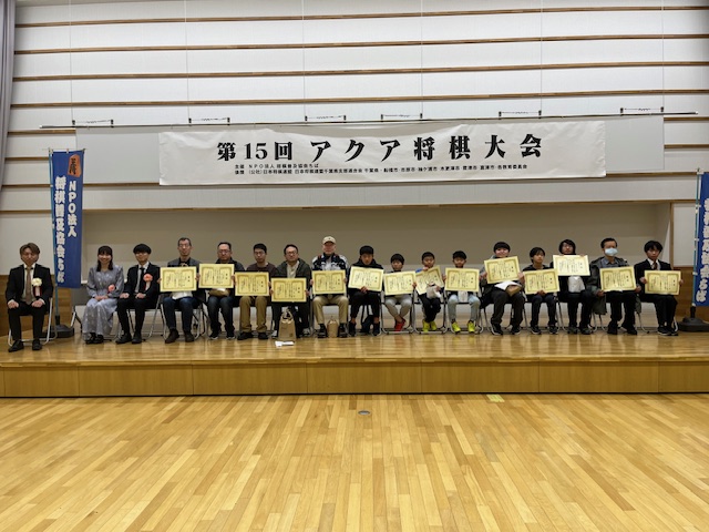 ABCクラスは20分切れ負け、DEクラスは15分切れ負けで、5時間にわたり激戦激闘の対局が行われました。第13回アクア将棋大会の優勝杯は、新田彩人氏(君津高校3年)に贈呈され、記念写真の撮影で全日程を終了しました。入賞者は次のとおりです。