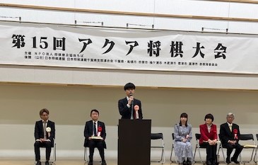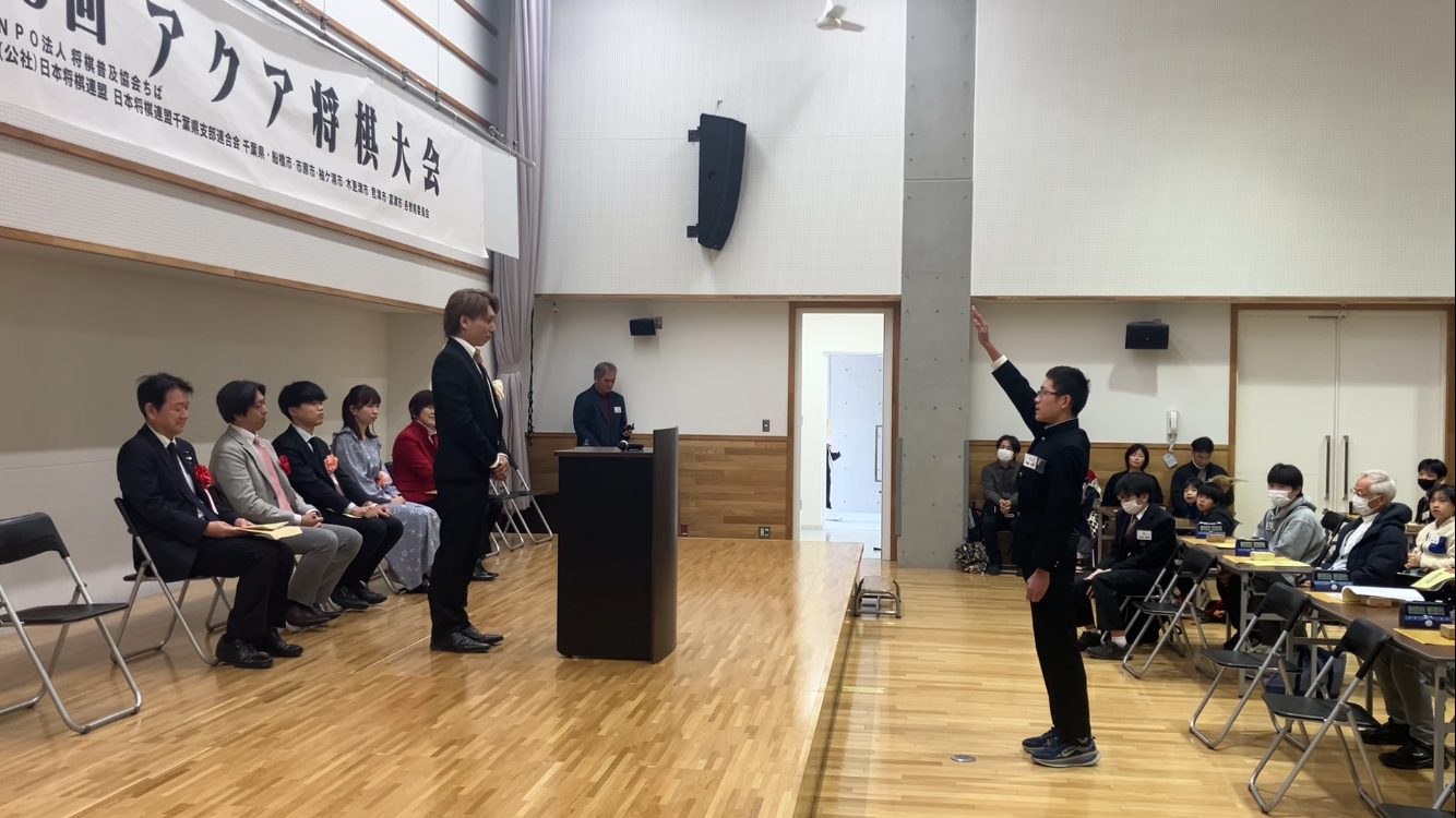 第9回アクア将棋大会で挨拶する環那棋士